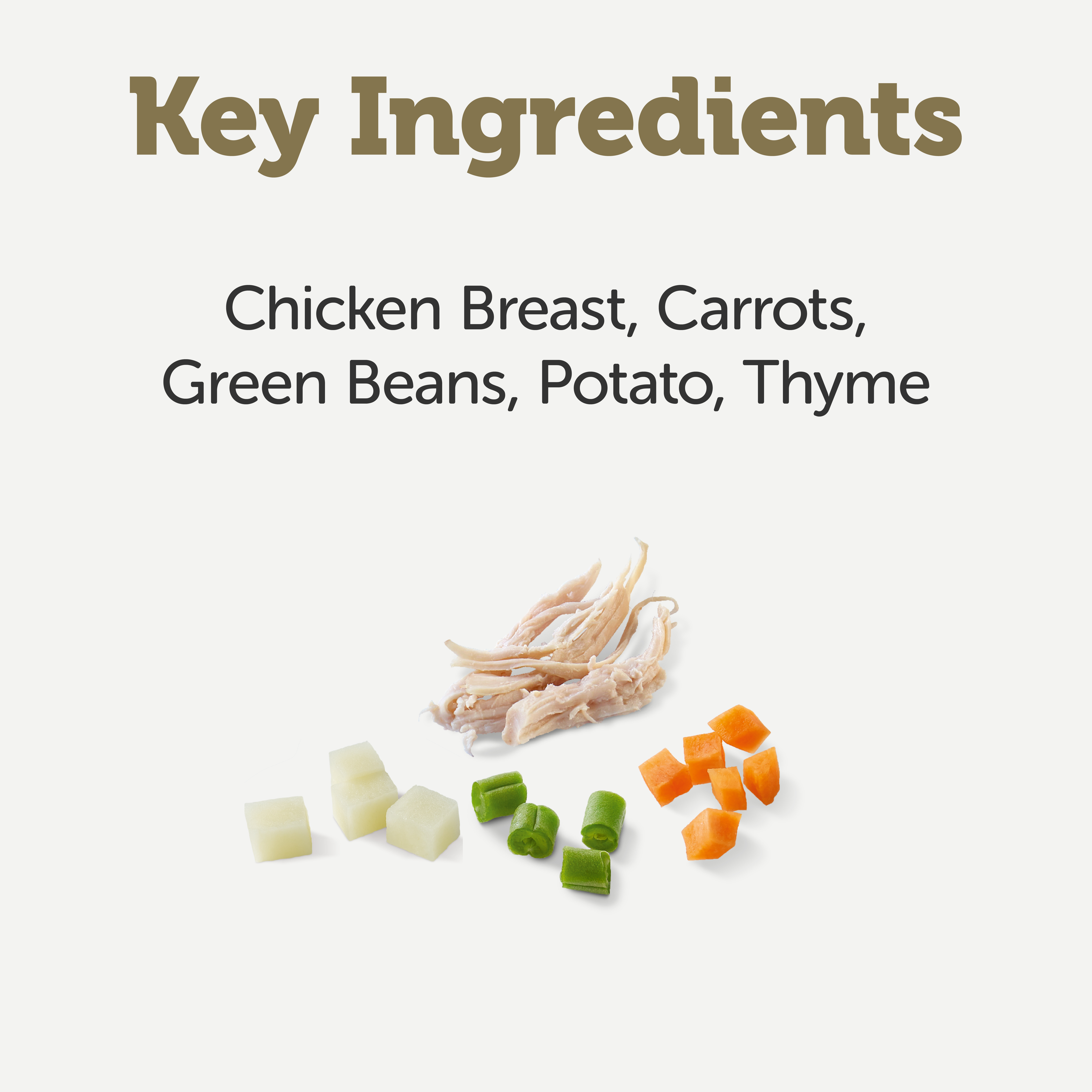 Pierś z kurczaka 40%, marchew 10%, zielona fasolka 10%, ziemniaki 5%, roślinna substancja żelująca, tymianek; Wołowina 40% (wołowina, wątroba wołowa), marchew 10%, groszek 10%, czerwona fasola 5%, roślinny środek żelujący ; Pierś z kurczaka 26%, jagnięcin